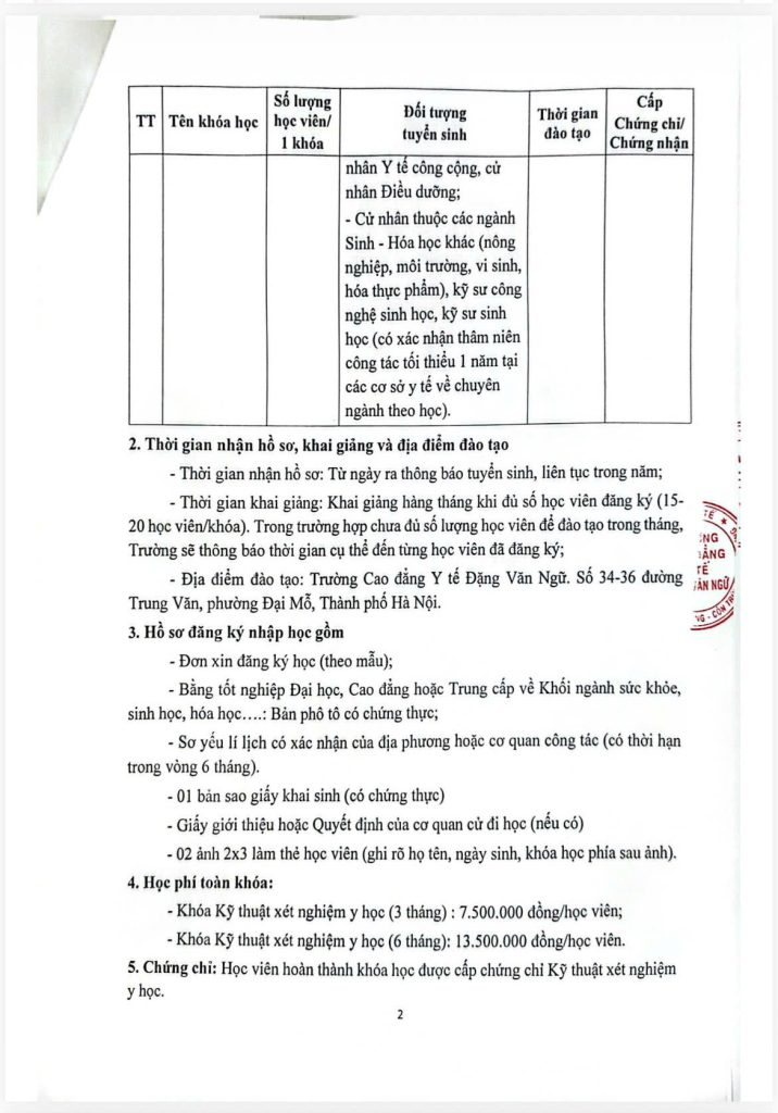 Có cơ hội cao được cử đi tu nghiệp nâng cao tay nghề tại nước ngoài hay thăng tiến khi công tác: Chương trình học Văn bằng 2 Cao đẳng kỹ thuật xét nghiệm y học tại Cao đẳng y tế Đặng Văn Ngữ cung cấp cho bạn các kiến thức y tế hiện đại nhất, giúp bạn tự tin làm việc tại các cơ sở y tế cả trong và ngoài nước.